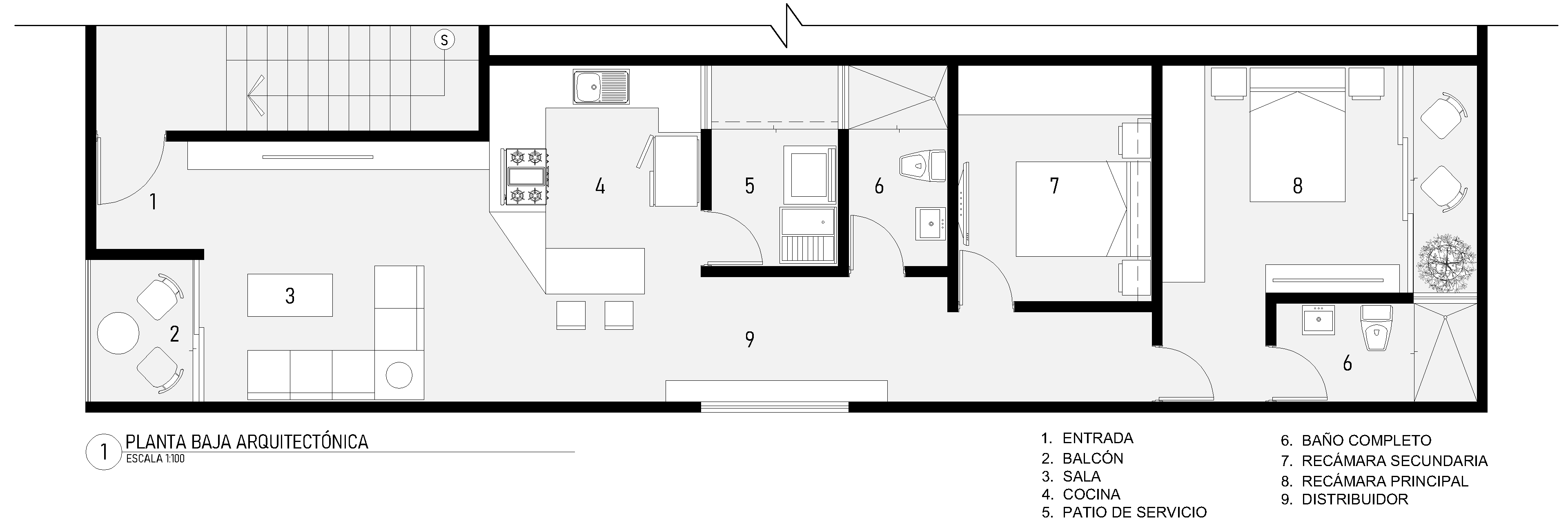 El proyecto se desarrolla de manera lineal, con un ancho de 3.70m en su parte mas angosta y 4.70m en su parte mas amplia, cuenta con sala, cocina con barra desayunadora para 4 personas, dos baños completos, un patio de servicio, recámara principal con una pequeña terraza y una recamará secundaria.